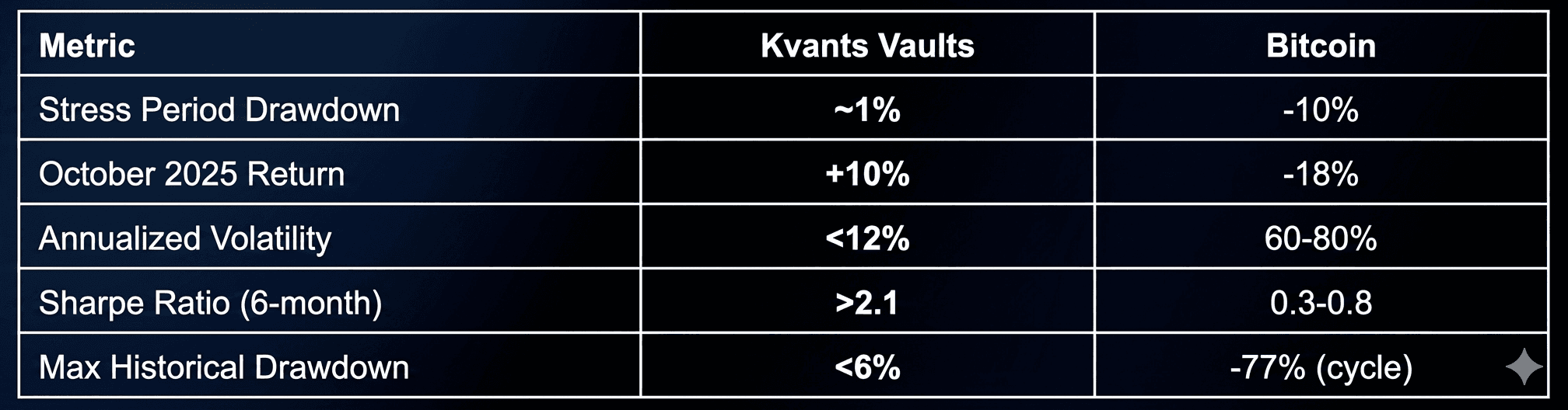 The contrast is structural, not coincidental. During the largest single-day liquidation event in crypto history, Kvants Alpha Vault generated positive returns while directional portfolios suffered catastrophic losses. This outcome reflects the fundamental difference between harvesting market microstructure and betting on price direction.