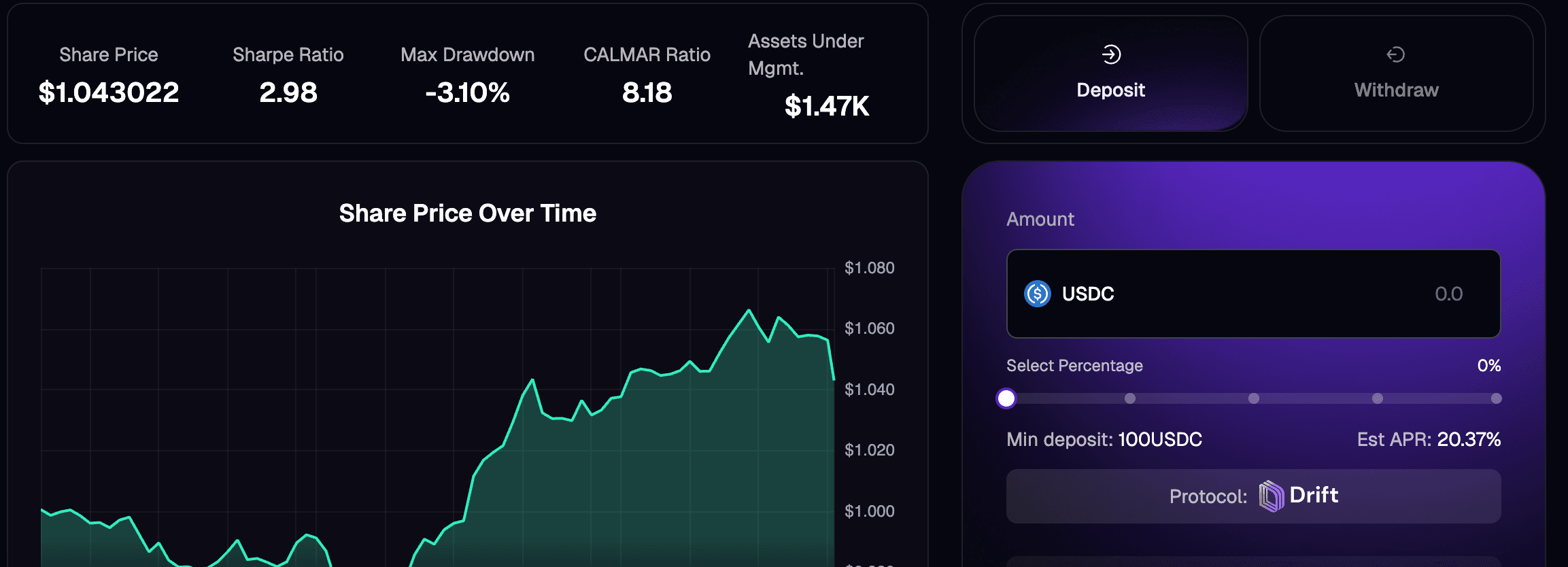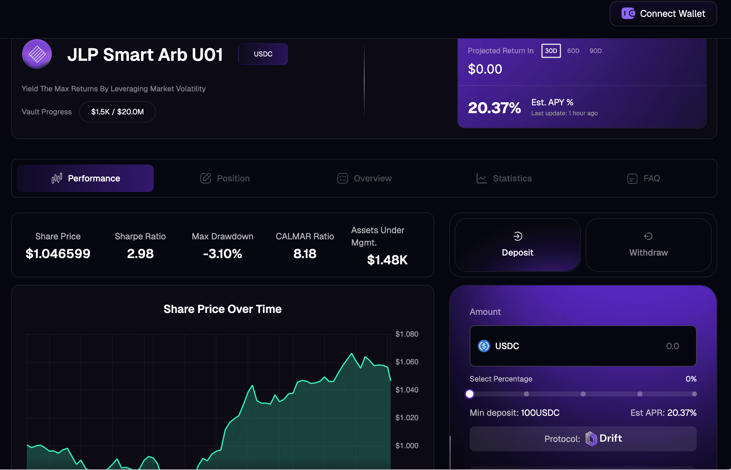 Each strategy is risk-scoped and executed using Kvants’ AI-based execution framework, which optimizes for slippage, latency, and rebalancing efficiency. Returns are compounded per block and rebalanced dynamically based on market structure shifts. The KVANT ALPHA U01 Drift Vault, which uses USDC as base collateral, is purpose-built for investors seeking high-frequency, capital-efficient yield with full downside control.