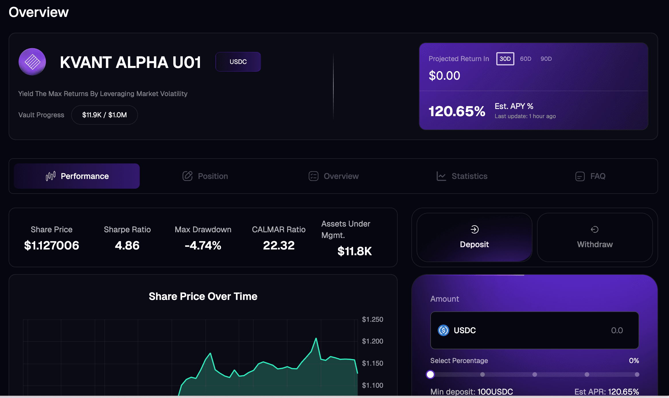 Capital can be allocated to these vaults with clear expectations around risk, lockup terms, and expected yield. For institutions managing large balances in USDC or stablecoin reserves, vaults like KVANT ALPHA U01 present a structurally superior return profile compared to passive BTC exposure or staking in volatile assets.