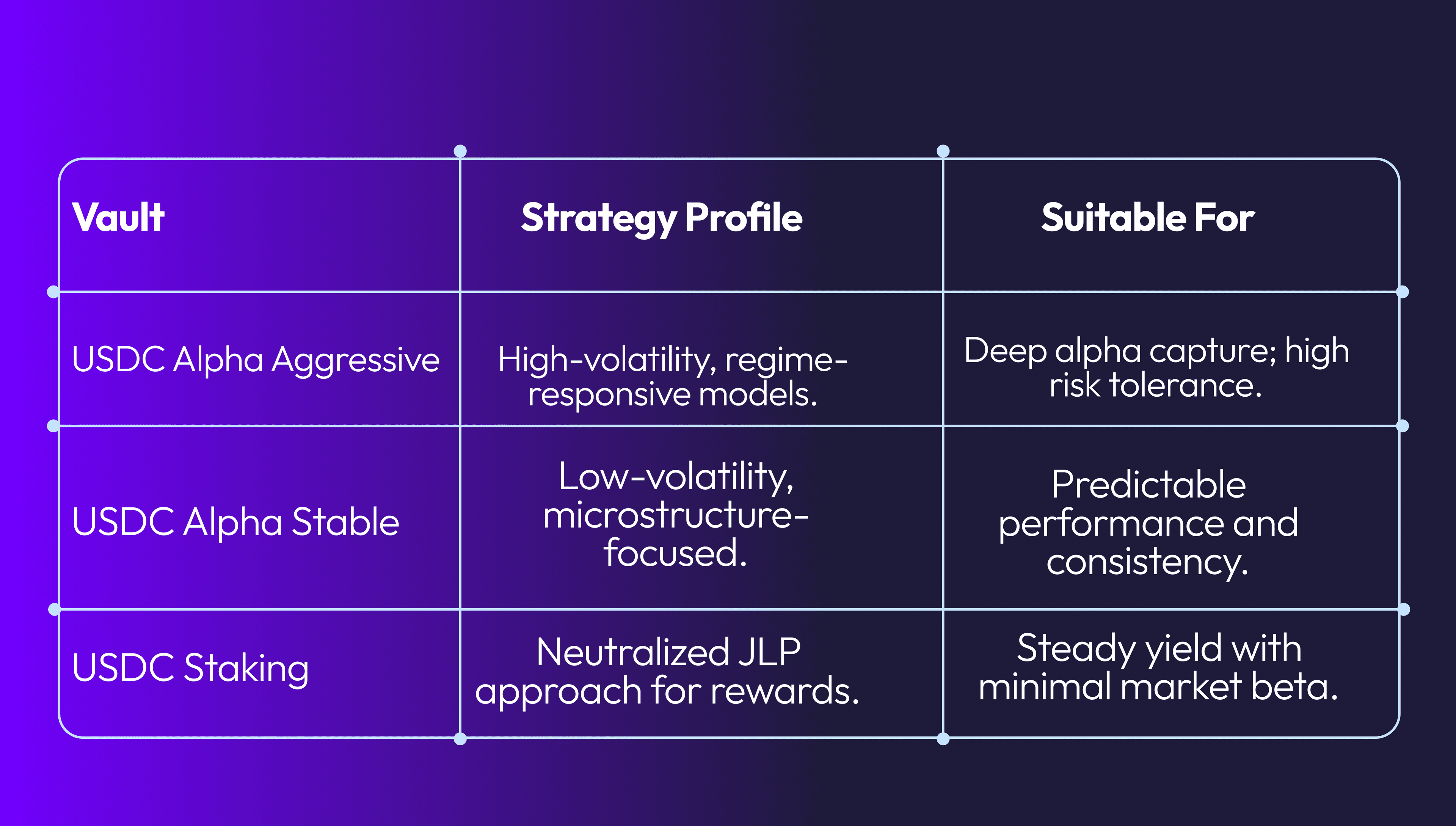 Selecting a vault aligns your capital with the appropriate mandate, operating logic, and volatility tolerance. The buffer period ensures orderly unwinding of positions and protects the strategy from execution impact.