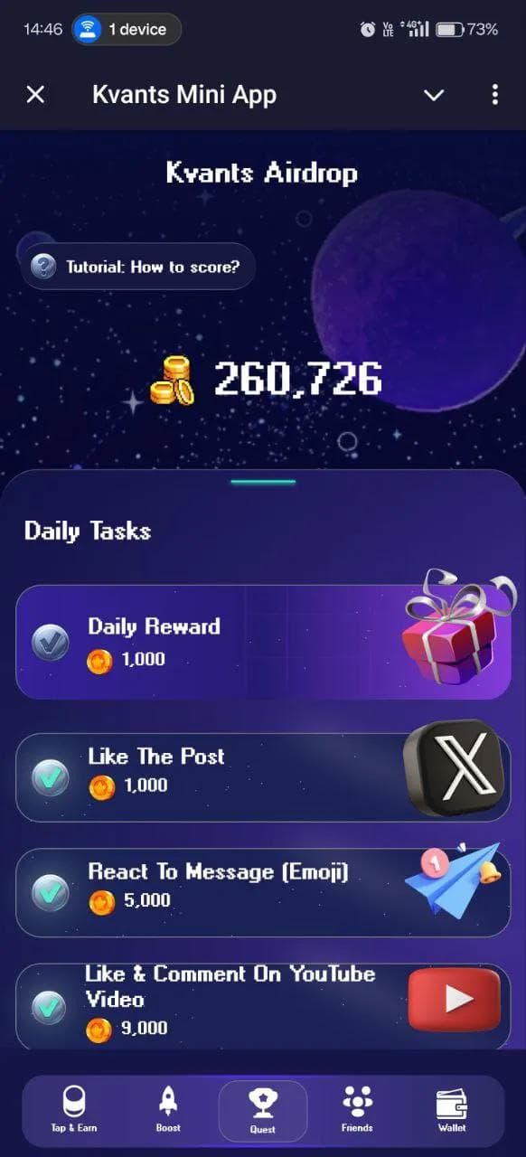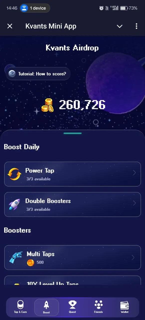Let’s be real, it all comes down to the tap. The more you tap, the more Kvant Points you collect. But don’t just spam away — be smart about it.
