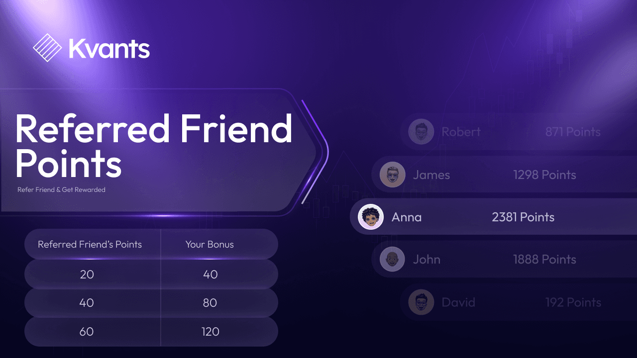 At Kvants, we believe that trading should come with more than just market returns. That’s why we’ve built a rewards system that lets you earn points for deposits, referrals, and consistent engagement. The more active you are, the bigger the rewards—whether that means unlocking premium perks, cash bonuses, or even a share of Kvants’ revenue.