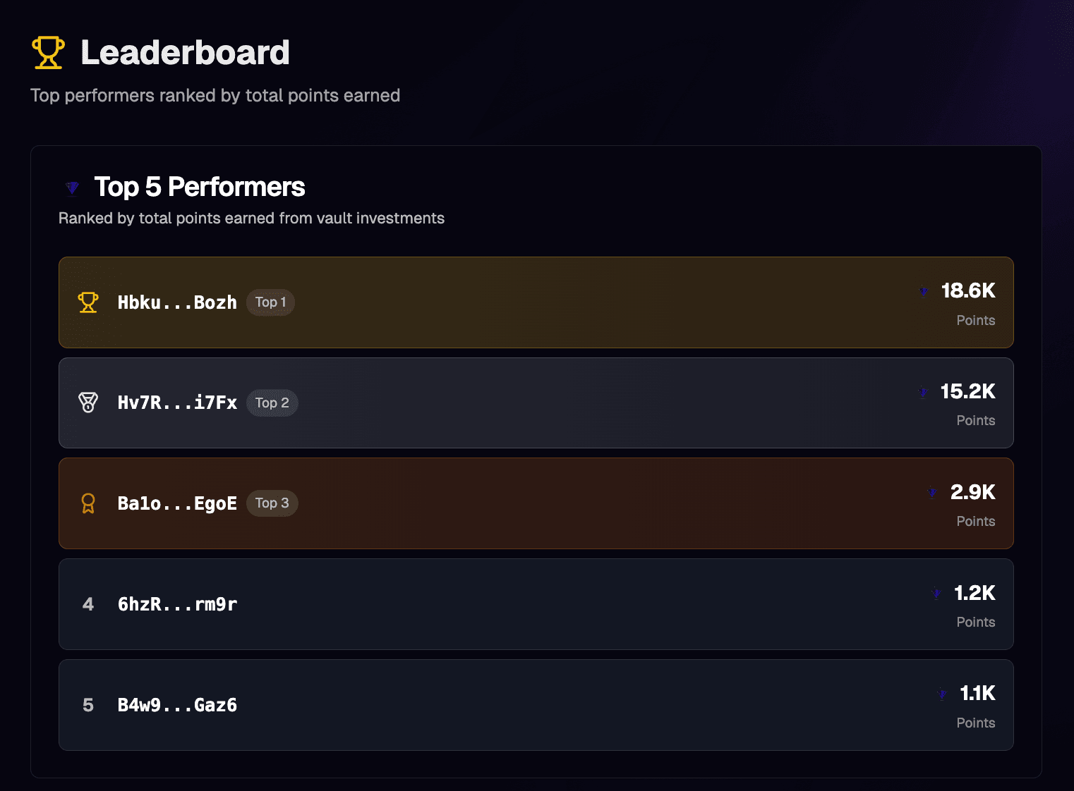 The leaderboard ranks vaults based on performance across varying time horizons to show which strategies have delivered the strongest risk adjusted returns. It allows users to compare consistency, volatility characteristics, and long horizon stability. This enables informed allocation decisions for both institutional and retail participants.