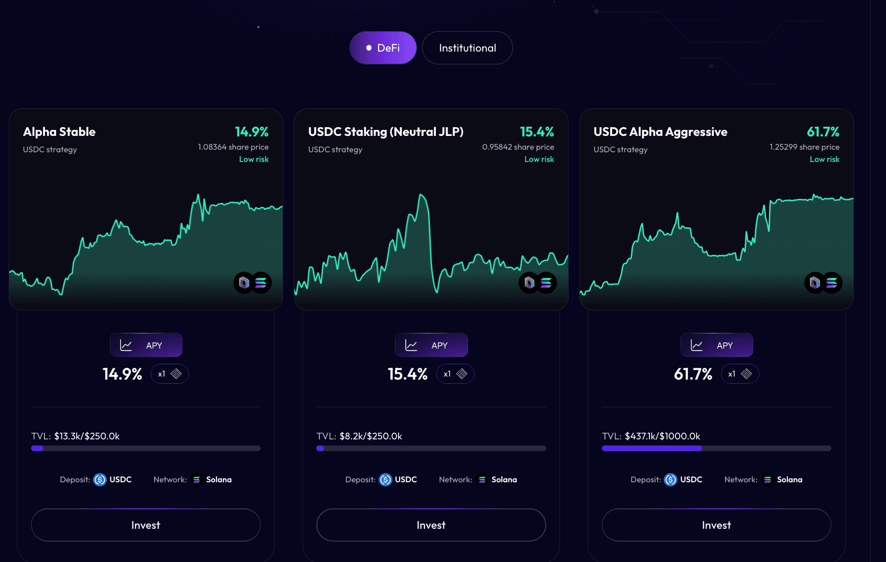 This vault applies a neutralised JLP approach to capture staking and liquidity rewards without directional market exposure. The aim is to produce steady yield with minimal beta. It serves investors who want reliable accrual rather than volatility driven alpha.